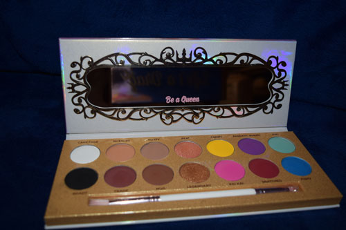 To start with the packaging is everything and I love it. It comes in a reflective box with the brand and palette names on the front. The palette design itself I also love. For me, the eyes really make the palette stand out from others and the reflective finish is everything. The brand name is on the back which is so simple and gorgeous. There’s a miror on the inside lid of the palette. It’s a little small for me but I do love the “be a queen” message on it.