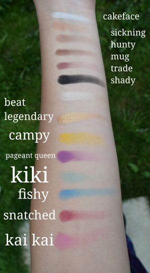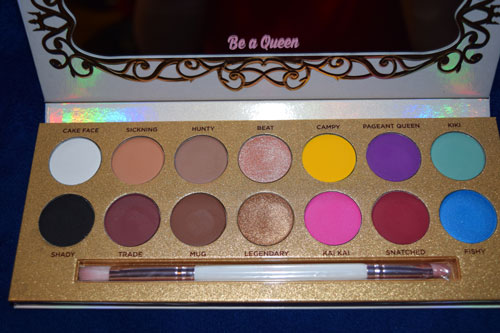 The size of the palette is good and seems to be pretty solid. You get 14 shades and a dual ended brush within the palette and all the shade names are perfect. All the shades names are words associated with the drag community ranging shady to kaikai to fishy. The shade range is great. Only 2 are foiled and the rest are all matte with both neutral and bright shades as well as the traditional black and white.