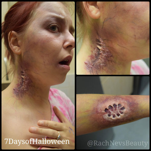 Although they can smudge easily, these paints do last throughout the night. A light rain and sweat didn’t budge these from my face during Halloween weekend. I’ve been playing with multiple brands of creme paints depending on what colours I’ve needed for looks. For colouring large areas I’ve been using the Nyx SFX Creme Colour paints. I also purchased 2 of the Kryolan paint wheels (zombie, burn and injury) and these pretty much contain all the colours needed for basic effects makeup.
