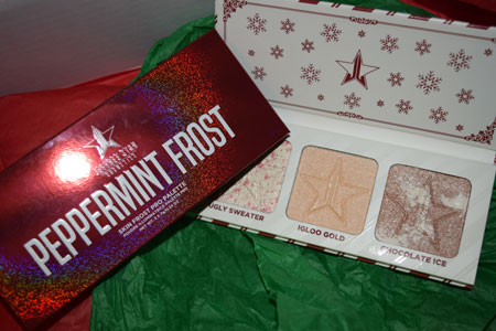 The second product that I tried was the other exclusive item; the Peppermint Highlighter palette. This smells so lush, peppermint of course, and has 3 gorgeous shades. All 3 shades are blinding and should work for all skin colours. I love the holiday packaging of this palette.