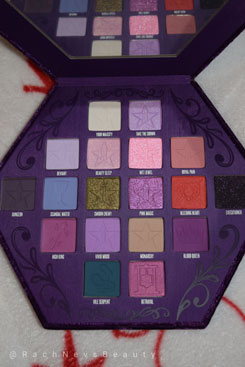 The palette itself is pretty unique even for Jeffree Star standards. A hexagonal palette covered in a lush crushed faux-velvet purple. As always, it does have a clasp for closure and a huge mirror on the inside lid. There is also a mirror protector as well to stop your shadows transfering.