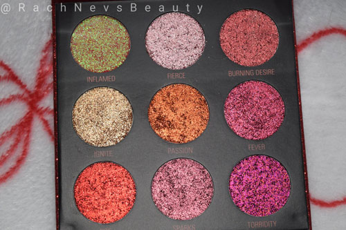 There are a few pressed glitter palettes in this range each reflecting a different colour. You can pick up all the palettes from the Makeup Revolution website (see here) and they retail for £10 each. I got the Hot Pursuit palette which is a collection of pink, red and gold. Makeup Revolution is 100% cruelty free but only 3 of these palettes are suitable for vegans. This is one of them.