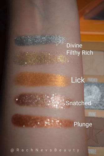 When doing the swatches, some of the lighter shades did need a few swipes to build up the pigment. Most of the shadows felt silky and buttery to touch with the exception of filthy rich and plunge. They had a slight gritty feel to them with the glitter particles being bigger.
