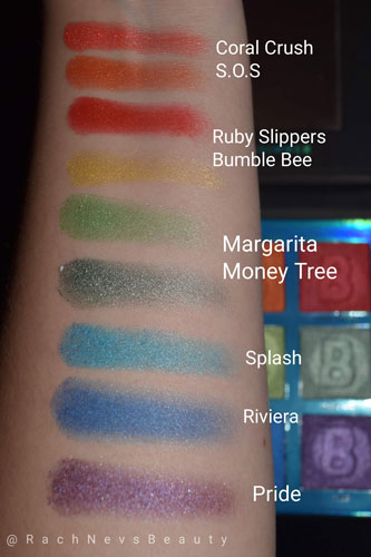 The palette contains 9 shades; rainbow shimmer of course. Every colour in the rainbow has a slot and in shades that will work well together for a range of finishes to looks.