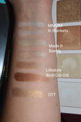 On the skin, these look so gorgeous. I love the shades MMMM and In Blankets, they are just so blinding with that little bit of glitteryness. These work best with my skin tone although Made It and Baebly offer a softer more natural highlight for me. Although the shades Lifestyle and Bodi-Odi-Odi are too dark for my cheek and brow bone highlights, these look amazing in the inner corners.