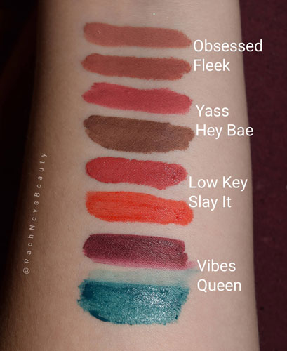 The matte liquid lipsticks have a smooth, creamy formula that glides on easily. One or two did look a little bit patchy when I was swatching them but on the lips they are fine. They are very pigmented and last for several hours at a time. They do take a minute or so to dry down to matte but I don’t mind this. The different shades also blend together well if you want an ombre lip. I didn’t notice my lips drying out and I actually forgot I was wearing these on several occassions they are that weightless.