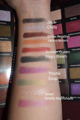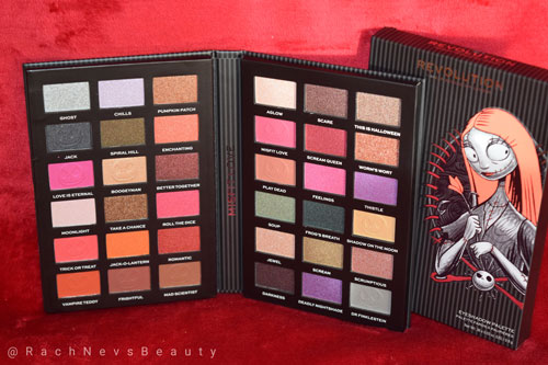 The packaging is just like the rest of the collection. Grey and black stripes with embossed characters except this time we have Sally and not Jack on the front. All product information can be found on the outer box including the ingredients. The palette is well made and sturdy without being too heavy. The only complaint I have is that we have Jack’s head printed into the pans and not Sallys.
