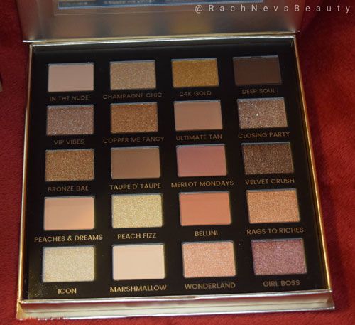The packaging screams class with it’s minimalistic gold look. Both the outer sleeve and the palette have this design and both contain the ingredients list. It’s a little bit deeper than most palettes but it’s not heavy to hold. There is a decent size mirror in the lid along with a magnet closure. The pans are a standard size with shade names written underneath. I hope they’re as deep as the packaging.