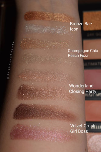 There is some kickback in the pan for the majority of shades although there’s less for the shimmer shades. There is slight fallout under the eye with the darkest matte and for most of the shimmers but I can live with that as it wipes away easily. The shimmers and glitters can transfer slightly to the crease if you have hooded eyes but it is minimal and I didn’t notice any creasing after 8 hours of wear.