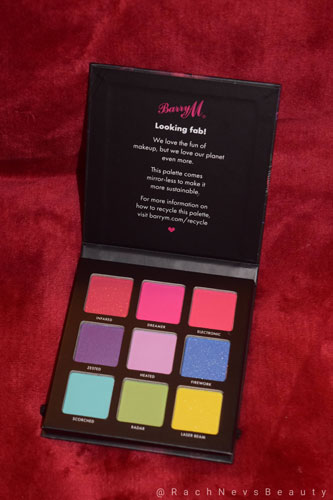 The packaging is so cute and perfect. The neon sign on the front really gives you an idea of the colours inside. I love that this is made from sustainable card and is recyclable which is why there are is no mirror or magnet. Instructions on how to recycle your palette can be found here. There’s an elastic strap at the bottom to keep that cover closed. All product information can be found on the back of the palette.