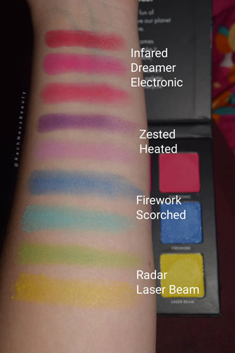 When doing the swatches, the shadows felt soft and buttery and swiped smoothly. The red and pinks looked more vibrant with a single layer than the cool toned shades. The shimmer shades have quite a subtle reflex to them but they are still pretty. The least subtle of the shimmers is Infared with its gold reflects although it’s still not blinding.