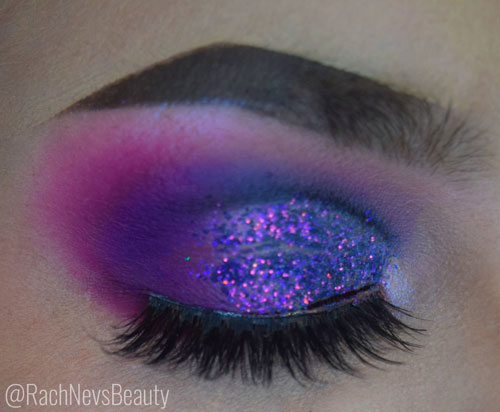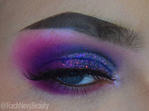 On the eye, the shadows perform well. They are extremely pigmented so take care when applying. I found them best used when I built up the pigment slowly while blending. The shimmers are easy to apply with a brush or finger and look stuning with their shine. The holographic glitters, although so pretty can be a little awkward to use. They’re easier to apply with a finger so there’s no neatness in application though they don’t fall off everywhere which is a plus. I also had a lot of trouble getting my lashes to stick to the glitter on my inner corner so yeah leave a gap.