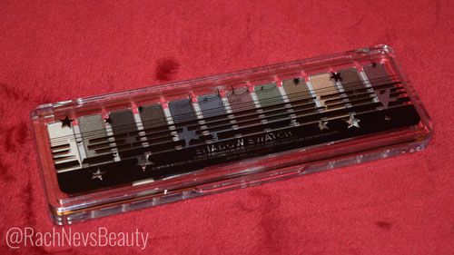 This is a 12 pan palette with a mixture of finishes. As with the other swatch palettes from Lottie London, the shimmers outnumber the mattes-there’s only 4 mattes. For a smokes palette it is kinda perfect though; you have your black, red, green and blue mattes which form the base of most smokey eyes and your shimmers offer variety.
