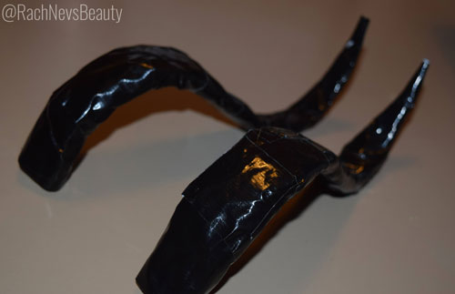 Making the horns is quite simple which I found watching an ElliMacs Tutorial (Youtube). You will need some aluminium foil and some duct tape. That’s it for the actual horns. You may need something to attach them too as well (see below). Simply scrunch your foil into the desired shape and length, using strips to create the desired thickness and trimming the tip to create a sharp point. Make sure to keep the thick end flat so you can apply them. Once done, wrap the horns in strips of duct tape, layering them over each other to create some details. And your horns are complete.