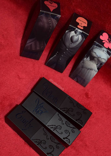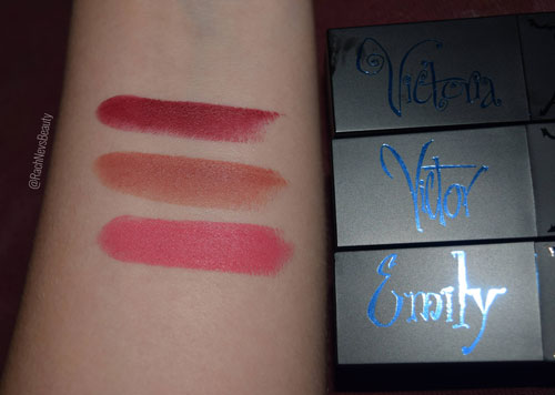 As mentioned above, the shades are inspired by the three main characters: Victor, Emily and Victoria. Victor is a matte nude; Emily is a matte pink and Victoria is a matte red. They are like the perfect base of lipsticks shades that you will need. I swatched them, of course and there is a clear difference between the shades. They are highly pigmented but not ridiculously bright. When applied to the lips, there’s no change to the lipsticks tone. They are all easy to apply and have a smooth, creamy formula. They blend well with lip liners but they can be worn alone. Each have a matte finish but they don’t dry your lips as the formula stays creamy. They don’t feel greasy at all either. Naturally they do transfer but not as much as you’d think: a lot of pigment remains on the lips.
