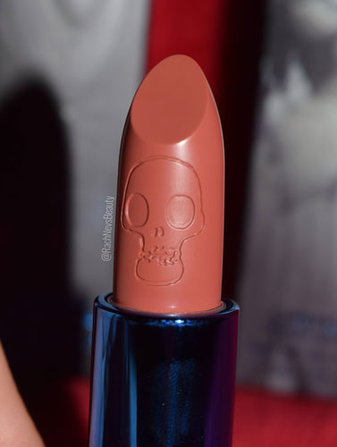 The packaging is so cute. The matte black outer box is embossed with thorny vines on the sides with each characters torso on the front. Brand and shade names are written in metallic blue all around the box and there’s also a sticker on the top showing the shade. The lipstick component is the same although it’s only embossed on the front. The square shape is surprisingly comfortable to hold when applying. Each character has their own symbol that is on the top of both the outer box and lipstick case. The cap of the lipstick fits snugly and the mechanisms roll smoothly. There’s a skull carving in the lipsticks too which I love.