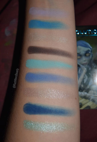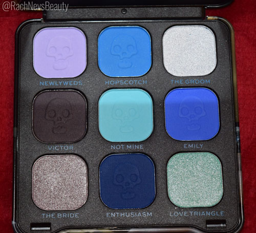 This is a 9 pan palette with a predominantly blue colour story but it contains some lilac and turquoise tones. The colour story is perfect for these two characters. There are 6 matte shades and 3 shimmers in this one which offer a slight variety to your eye makeup. The pans are a good size and also have skulls pressed into some of them.