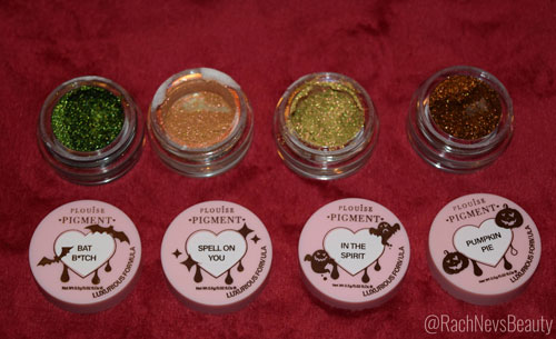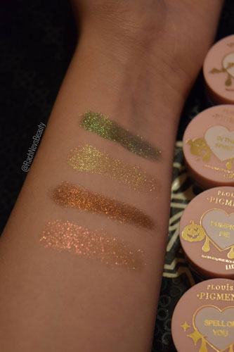 The product description states that these have been developed with a foiled, duo-chrome reflex. They have a finely milled, loose glitter consistency to achieve an intense finish. They should have a light reflecting, lustrous finish with an intense shine. The four shades are Bat B*tch (green/blue reflex), In The Spirit (gold/green reflex), Pumpkin Pie (copper/green reflex) and Spell On You (gold/pink reflex).