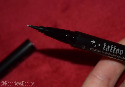 Both the mini and full sized products are pretty much packaged in the same way. The full size liner comes with an outer box containing all product information. Not sure if the mini has one…mine didn’t but I don’t like to assume from a beauty box. The tattoo liner is a liquid liner in pen form with an ultra fine brush tip. It has a tight fitting cap that hopefully will stop your liner drying up. One thing though, everything is still branded as Kat Von D Beauty rather than KVD Vegan Beauty. So is this old stock or have they not bothered changing the packaging? Kinda worrisome.