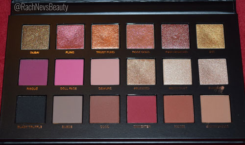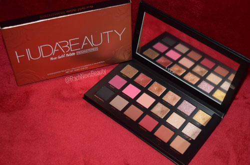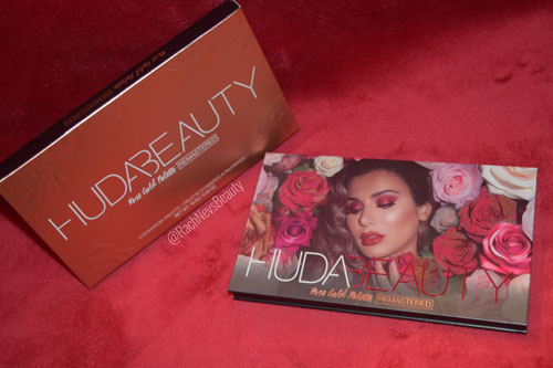 The packaging is properly gorgeous. The outer box is gold with white text. All product information including the ingredients can be found on the back and sides of the box. The palette features an image of Huda surrounded by roses. It’s a beautiful image made even better with gold metallic accents to highlight certain areas. It adds an extra dimension to it. The palette is a good weight and feels well made. It has a magnetic closure to keep the lid secure and features a huge mirror on the inside. There’s also a protective sheet over the shadows.