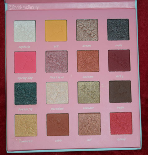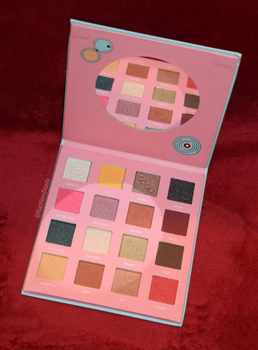 The packaging is really cute but very simple. There’s no outer box, just a sealed plastic wrapper around the palette. The three palettes are coloured differently but have the same design. Block pastels colours with cute decals on the front. The text is coloured to match the contrasting pastel shade on the inside of the palette. It has a fairly strong magnet for keeping the lid secure and there is a small mirror on the inside. It’s not too big and heavy for holding and the pans a good size.