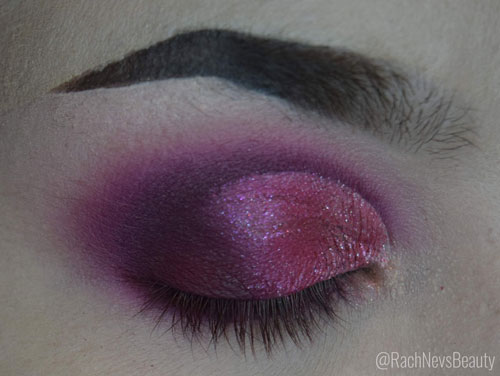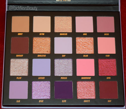 This is a 20 pan palette containing 12 matte, 7 shimmer and 1 duo-chrome shade. I really love the colour story of this one-lots of purples, pinks and nudes in a variety of tones. There’s a nice mix of lighter and deeper shades for creating a range looks with added variety coming from the shimmer shades. The pans are a good size for the price and have the shade names underneath.