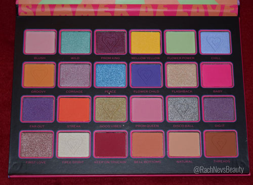 The packaging is soooo perfect for a 70s themed palette-bright colours and a slightly trippy design. I love the image of a young Homer and Marge on the front as it was their summer of love after all. Both the outer box and palette have the same design and contain all product details including the ingredients can be found on the back. The lid has a magnetic closure and a heart shaped mirror on the inside. There’s also a protective cover over the shadows.