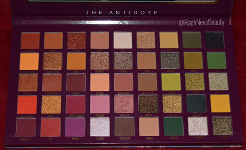 The packaging for The Antidote palette, although similar to previous installments has a different aesthetic. I love the purple ripple effect colouring with the gold writing on both outer box and palette. All product information including the ingredients can be found on the back of both. The palette itself is well made and sturdy with a magnetic closure for the lid. Despite it’s size, it’s not overly heavy for holding up. There’s a huge mirror on the lid and the pans are a decent size with the shade names underneath.