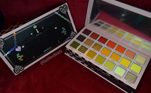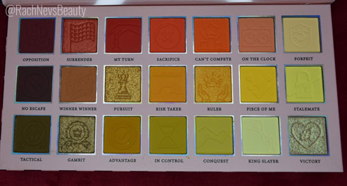 The packaging for this palette is amazing. There’s the outer box that contains all product information including the ingredients list. Both the box and palette have the same chess inspired, black, pink and holographic design with satin text against a matte background. The palette is where is gets really cool. It’s double sided with a chessboard in the center and magnets keeping all sections closed. Each side has it’s own colour story complete with protective sheets and a mirror in the lids. The design means that it’s not big for working with but is thicker and a little heavier than a standard palette.