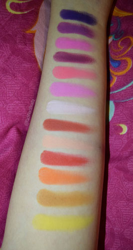 Like I mentioned before there are a couple of issues with this one. Aside from the patchiness with the 2 purples above, there was slight staining to the skin with some of the darker red based shades. It doesn’t last more than a day though and comes off easier with an oil based cleanser. Unfortunately, the shimmers do crease really quickly which is a shame. Easy to fix but it doesn’t stay un-creased for long. There’s some kickback in the pan for the majority of mattes and slight fallout under the eye with the shimmers.