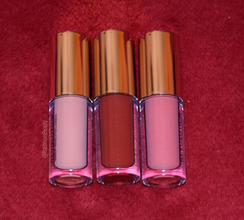 The packaging is minimalistic and similar to other Makeup Revolution products. It has a pink and gold outer box that contains all product information including the ingredient on the back. There’s a plastic holder inside keeping the glosses from rattling around. The glosses come in hard plastic tubes with doe foot applicators very similar to liquid lipstick packaging. The tube is secure, well made and surprising heavy for a mini. They’re the perfect size for putting into your bag. The doe foot applicators are a good shape but I wish they were a little bigger for product distribution.