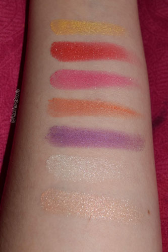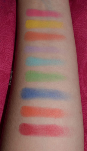When doing the swatches, most of the mattes were soft and swiped smoothly. The exceptions being the mid blue and one of the reddish browns. All of the pastel shades needed a double layer to even be seen so not sure how they’re going to be on the eye. The shimmers seem to have more pigment than the mattes but even then they’re quite muted. The shimmers swatched smoothly with one layer and showed subtle shine and glitter. The purple and red shimmers felt a little hard pressed but the rest felt soft to touch.