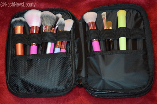I’m actually in love with this mini case. I was a little bit worried about the size at first thinking it might be too small but it’s kind of perfect and fits all my brushes in. It’s the size of an A5 book only thicker making it fairly lightweight and compact. Obviously it get’s heavier when filled with brushes though it remains easy to carry due to the handle on the long side of the case. Everything feels high quality, well made and robust including the handle, zips and pouches. The outer covering feels tough and made to last for a working makeup artist. The straps have plenty of give to them making it easy to get items in and out while the pouches add extra security. On the outer sides, there are also some netted pouches that add space for other tools such as disposable wands, sharpeners etc.