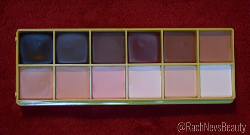 The packaging is fairly typical of Made by Mitchell. The item comes in an outer box bearing the product name on the front and other information including the company name and ingredients list on the back. Both the outer box and the product case features the traditional neon green with the product name coloured to match the shades inside. The box has satin highlights but the actual case is fully matte with a soft touch finish. You can find all the shades and their names on the back of the case but no other information. The lid is where I have an issue with the packaging. There’s nothing to keep it in place and falls off easily. The case is split equally into 12 pans that look quite deep.