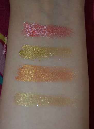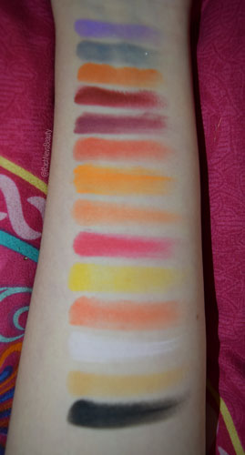 On the eye, the shadows aren’t the most pigmented shades out there but they’re certainly not the worst. Unfortunately, a lot of On the plus, all the shades can be layered and that vibrancy built up without any patchiness. They are all easy to blend and for the most part work well together but some of the oranges are too similar to use together. The shimmers look amazing, full of pigment and shine and last for hours without creasing.