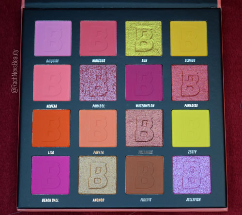 This is a 16 pan palette containing 10 mattes and 6 shimmer shades that scream tropical summer vibes. Twas the colour story that sold this palette to me in all honesty and I love that there are multiple colour blending options for a smaller palette. The pans are the standard size for Beauty Bay palettes, being big enough for most eye brushes and the shade names are underneath.