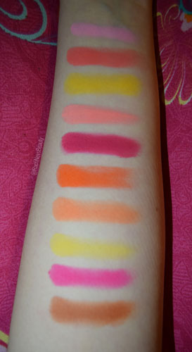 There was some kickback in the pan for most of the shades but only the shimmers produced fallout under the eye. Even then it was minimal and easily removed. The pink shades did stain my eye slightly but it didn’t last longer than a day and wasn’t too noticeable.