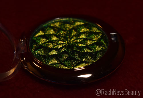 The multi-chrome shadows are available in 10 different shades and 2 different sizes. I grabbed the shade Medusa which has a 36mm pan containing 3.4g of product. This has a multichrome effect switching between gold, green and turquoise. Not going to lie, it’s really hard to capture the colour change on camera. I love the geometric design stamped into the shadow as it allows that colour shift to be seen in person.