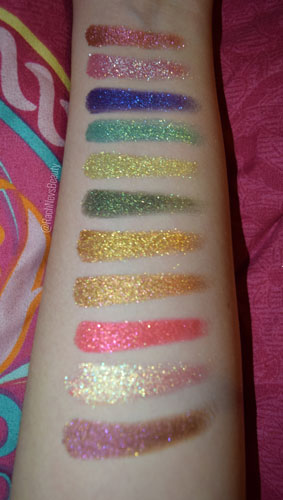 When doing the swatches, all of the shadows felt soft and although they were all easy to pick up on the finger, some felt drier than others, if you get me. You can kind of see it in the swatches with some not swiping as evenly as others. It’s mostly those darker shades to be honest. Some of those lighter shades needed a couple of layers to get that pigment to pop on the skin. The shimmers feel almost creamy and swipe easily and evenly.